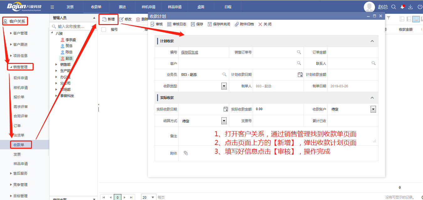 1、打開客戶關系,通過銷售管理找到收款單頁面