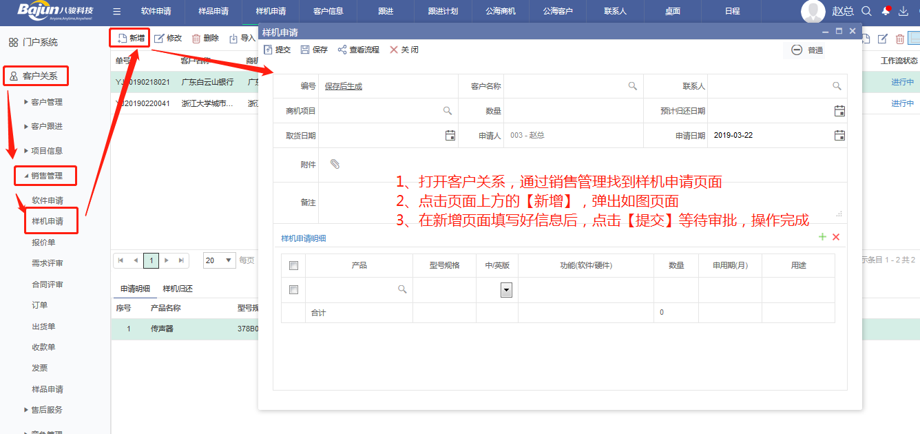 入口:客戶關(guān)系--銷售管理--樣機(jī)申請(qǐng)