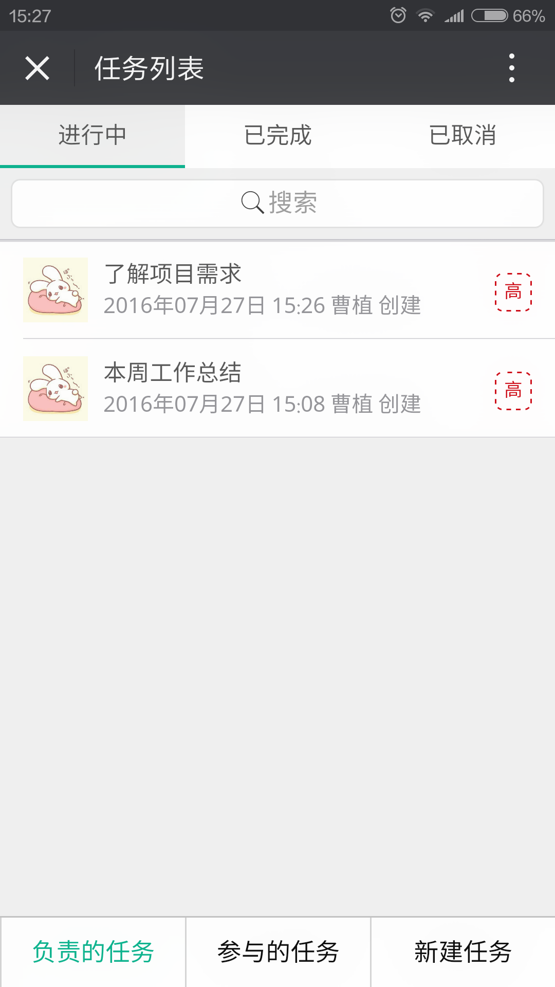 點擊“負責的任務”,可以看到由你為主要負責人開展的任務,并可顯示任務的進展狀態,分別有“進行中”、“已完成”及“已取消”。點擊任務項還可查看任務明細與任務動態,并支持對任務進行討論;還可進行完成任務和取消任務操作。